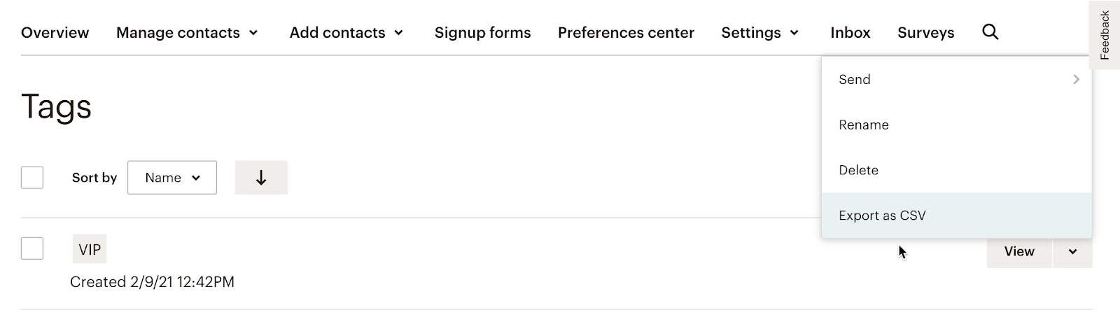 Begin door te navigeren naar Manage Contacts > Tags in Mailchimp om specifieke tags te bekijken die je wilt synchroniseren. Als je op de dropdown naast View klikt, krijg je de optie "Export as CSV" om je segment vanuit Mailchimp te exporteren. Gebruik de handleiding van Mailchimp voor meer informatie over het exporteren van contacten met specifieke tags.