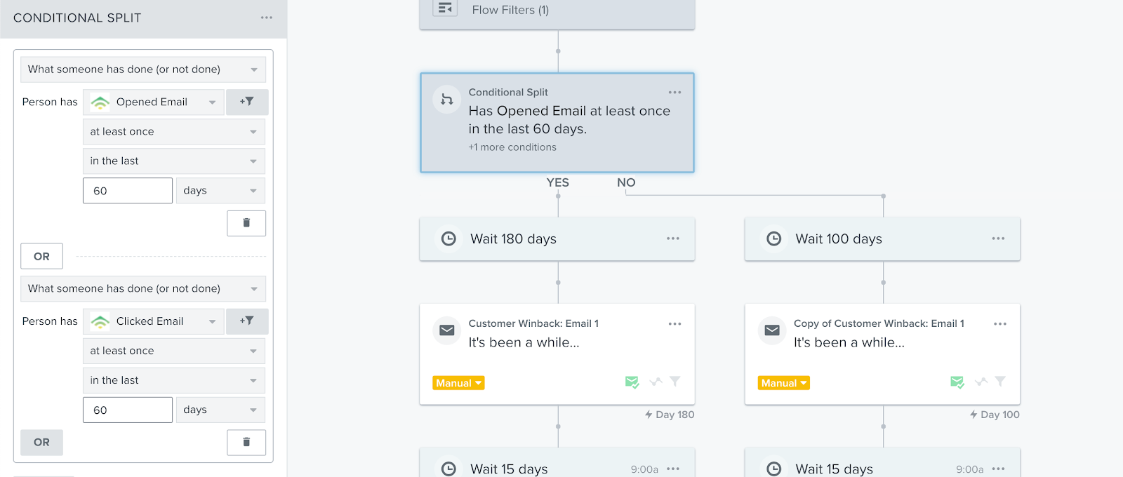 Probeer bijvoorbeeld de flow op te splitsen op basis van of ontvangers onlangs een e-mail of sms hebben geopend en erop hebben geklikt. Vervolgens kan je de timing tussen e-mails of de e-mailinhoud wijzigen op basis van deze informatie. Je kan bijvoorbeeld de tijden tussen e-mails wijzigen om iets korter te zijn voor degenen die recentelijk engaged zijn geweest, door hun prestaties te vergelijken met de rest van de ontvangers van jouw flow. Je kan ook testen of het verzenden van minder berichten effectiever is voor abonnees die de afgelopen 30 dagen een e-mail hebben geopend of erop hebben geklikt in vergelijking met het verzenden van alle drie.